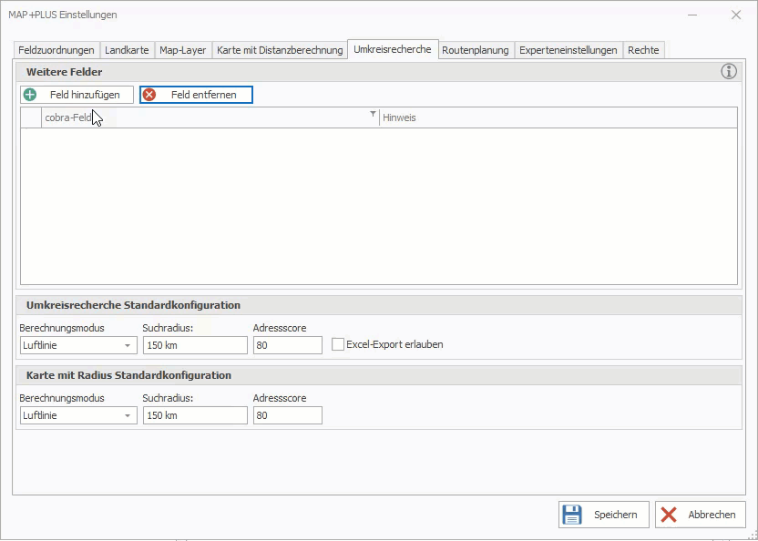 In der Umkreisrecherche können über die Einstellungen weitere Spalten für die Ausgabetabelle definiert werden. Durch diese Funktionserweiterung können die Ausgabemöglichkeiten individuell angepasst werden.